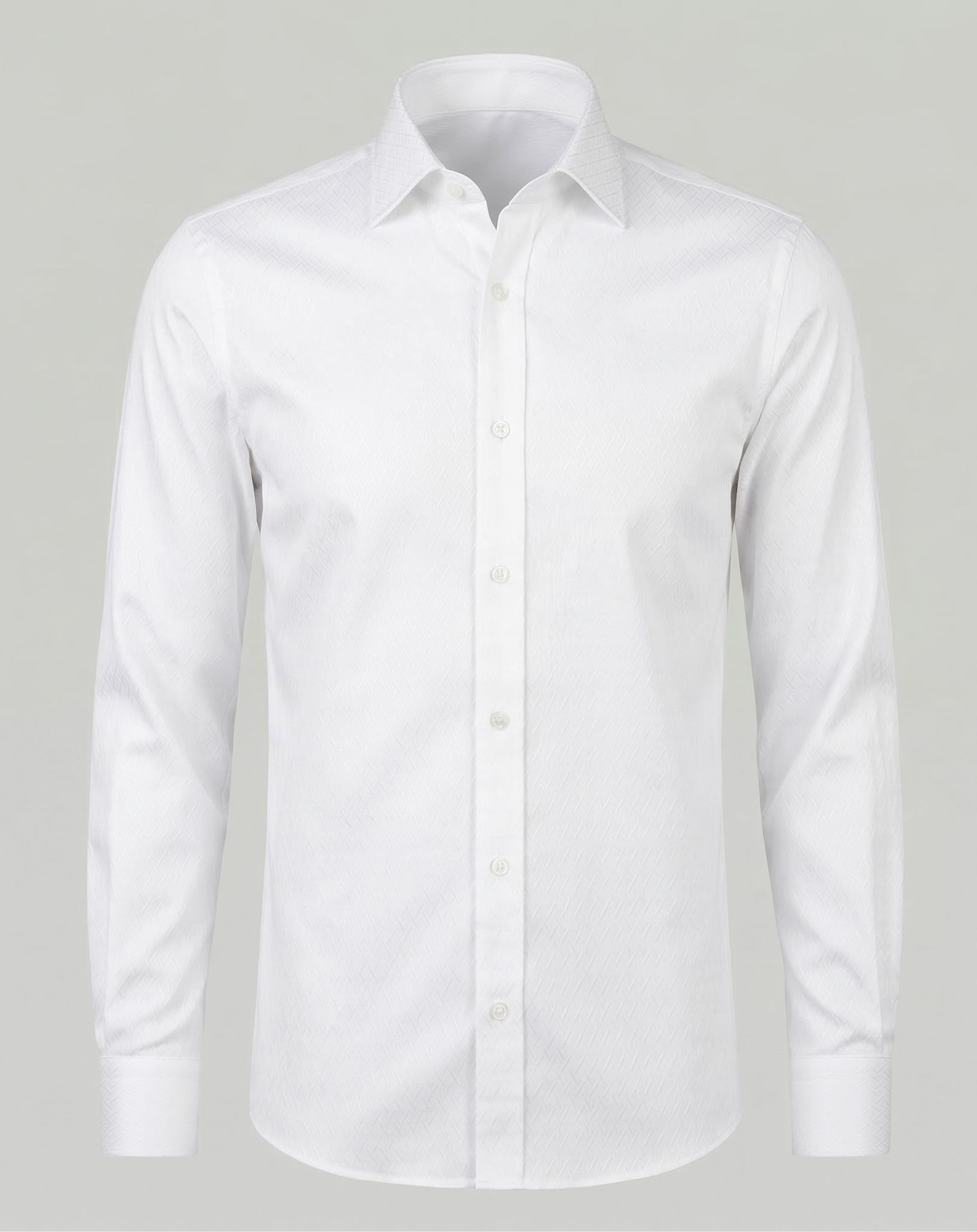 Приталенная рубашка белого цвета с классическим воротником и длинными рукавами (манжеты на пуговицах) с принтом.