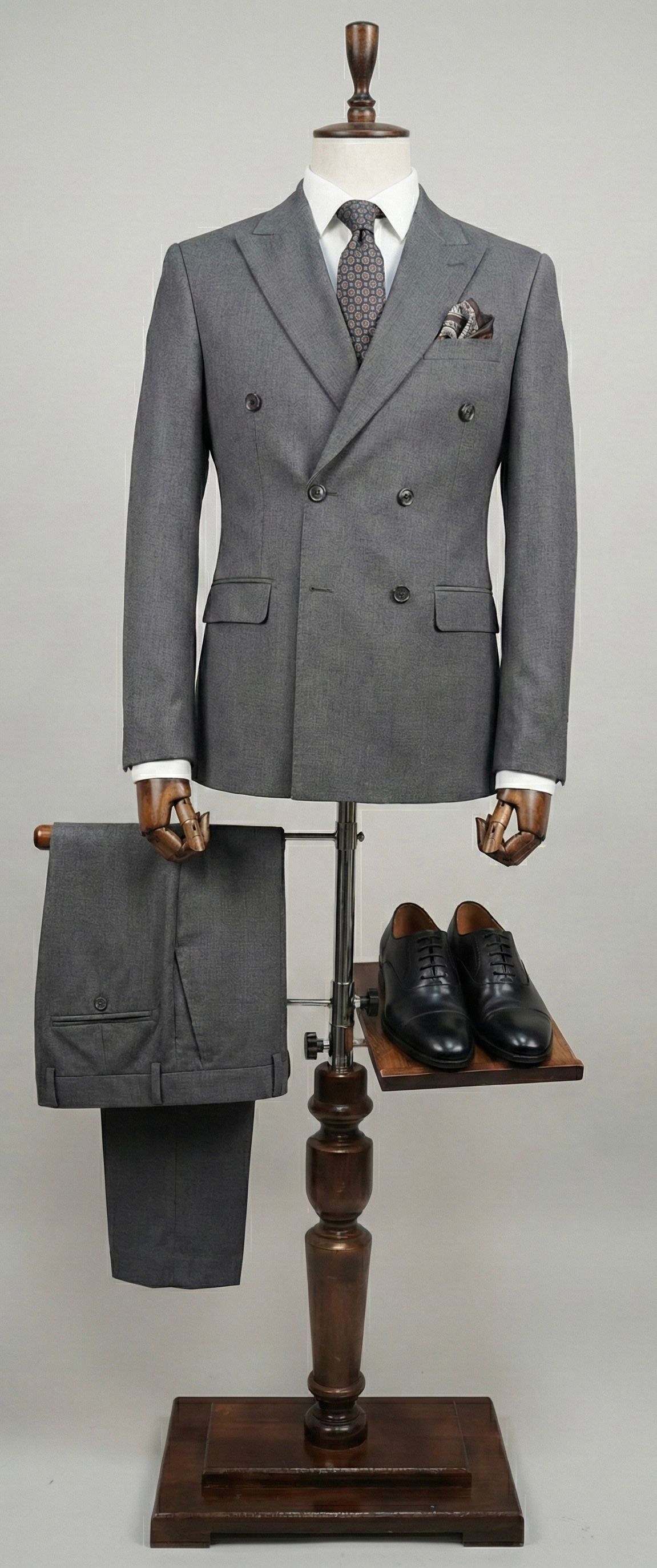 Этот изысканный серый двубортный костюм — идеальный выбор для современного джентльмена, ценящего безупречный стиль и комфорт.