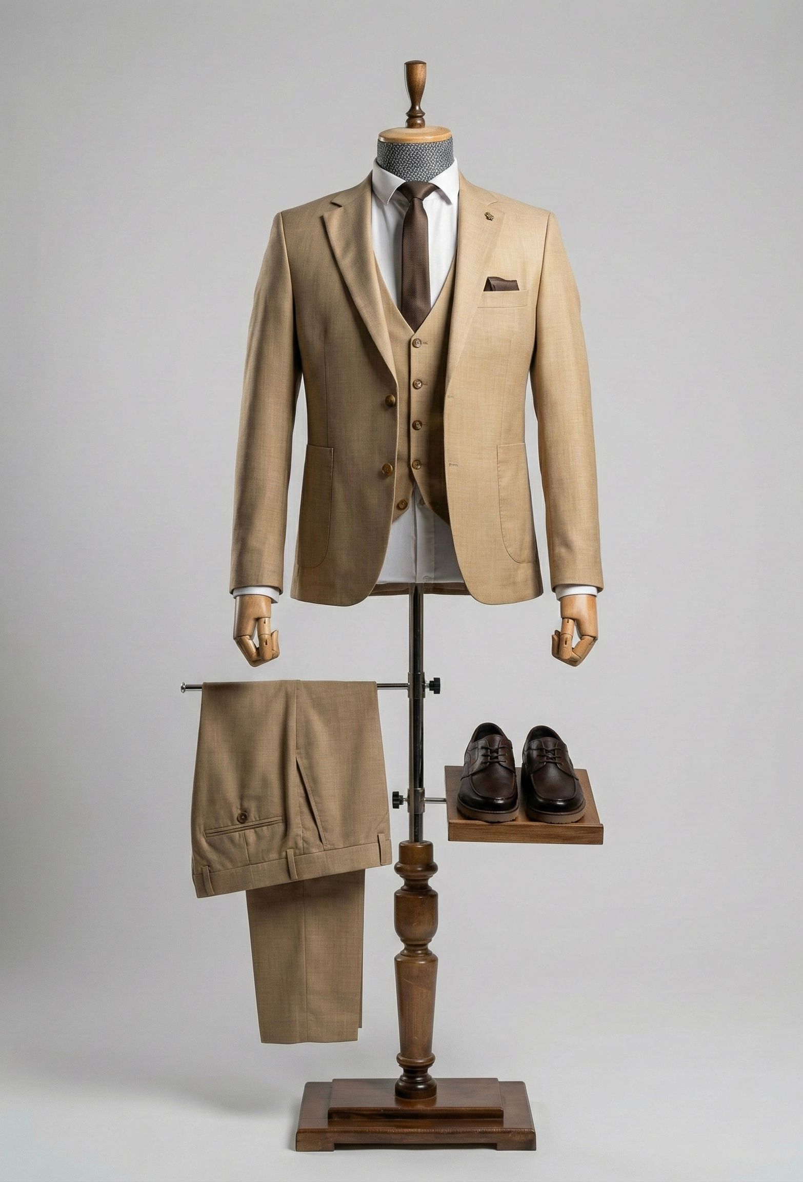 Элегантный и универсальный костюм-тройка в благородном светлом бежевом оттенке. Этот комплект станет отличным выбором для делового гардероба в теплое время года или для торжественных дневных мероприятий.
