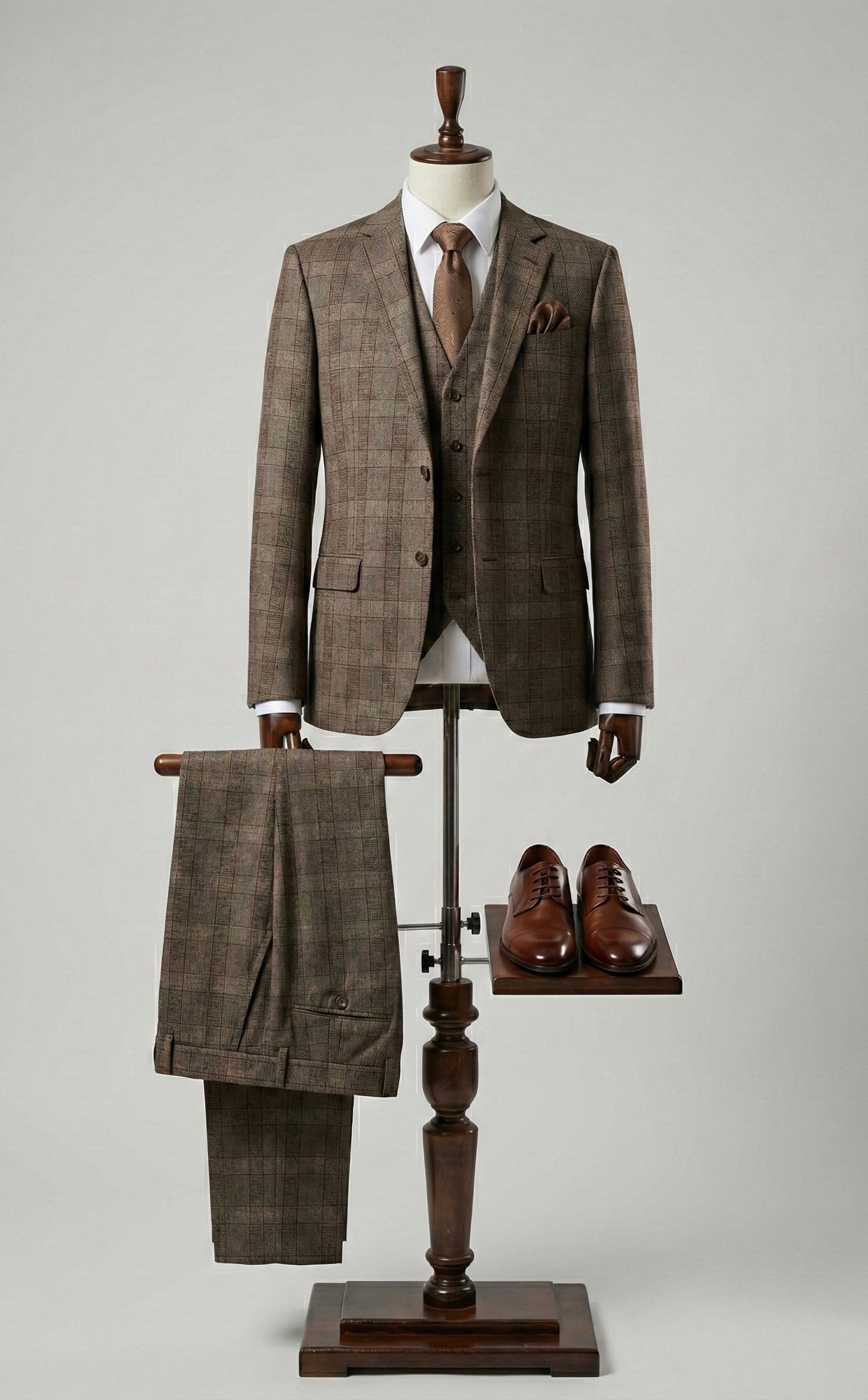 Стильный мужской костюм-тройка в классическую коричневую клетку — идеальный выбор для создания элегантного и запоминающегося образа.