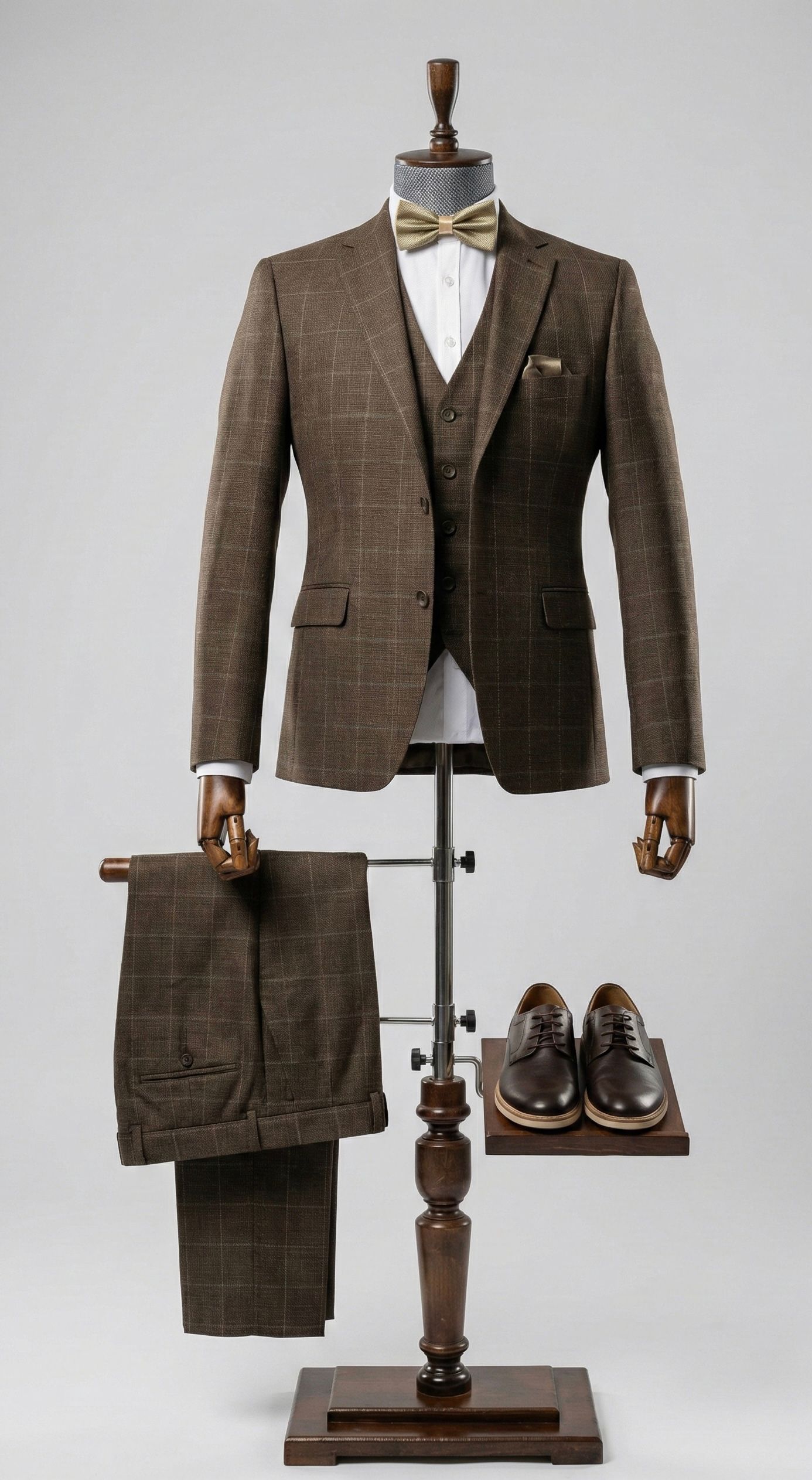 Элегантный и харизматичный комплект для тех, кто ценит британскую классику и индивидуальный стиль. Теплый коричневый оттенок и выразительный клетчатый узор создают запоминающийся образ, который идеально подходит как для деловых будней, так и для светских мероприятий.