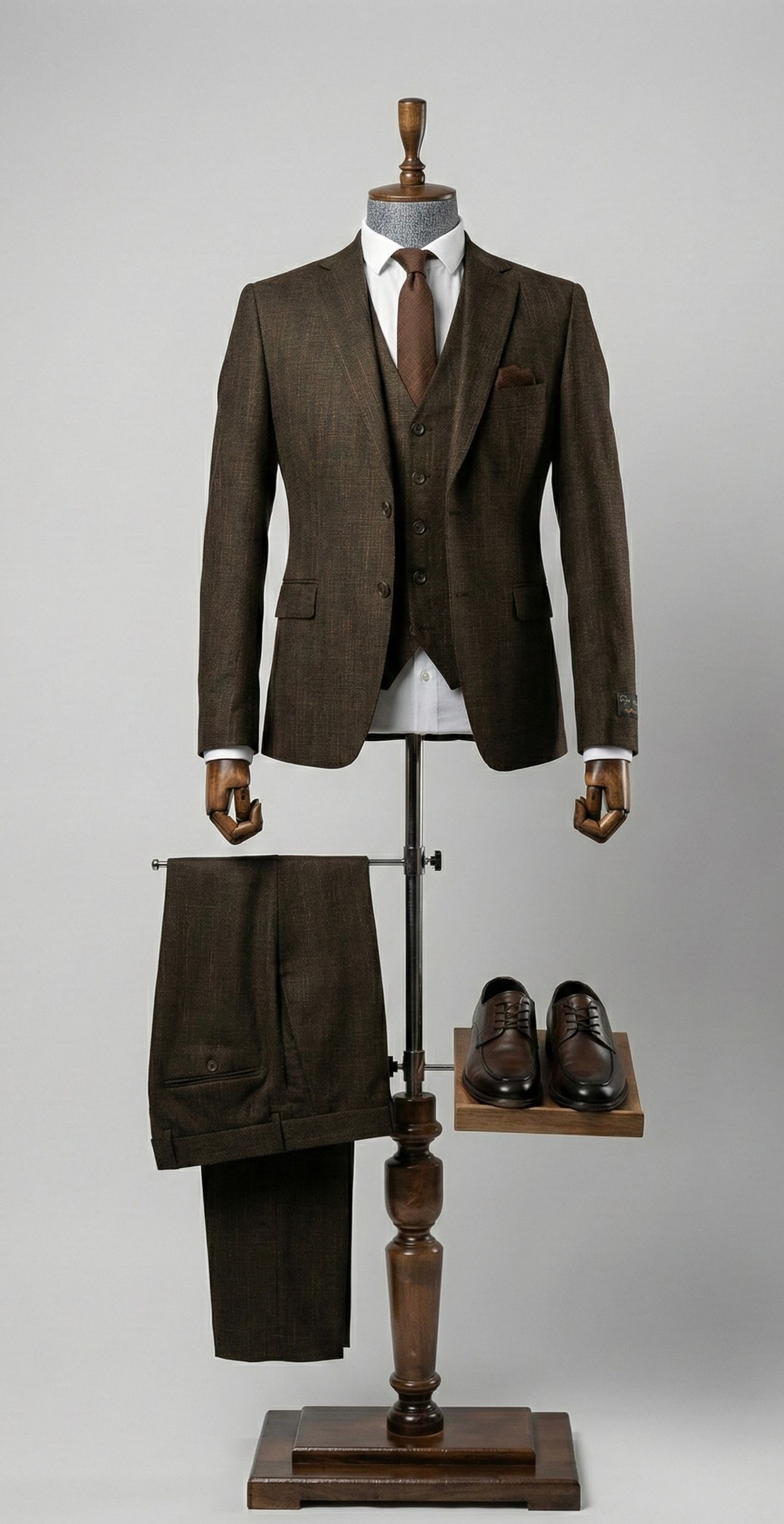 Этот костюм-тройка в глубоком коричневом цвете — идеальный выбор для мужчины, который ценит традиции, но не боится выделяться. Фактурное плетение ткани придает образу объем и благородную матовость, делая его уместным как на деловой встрече, так и на торжественном приеме.