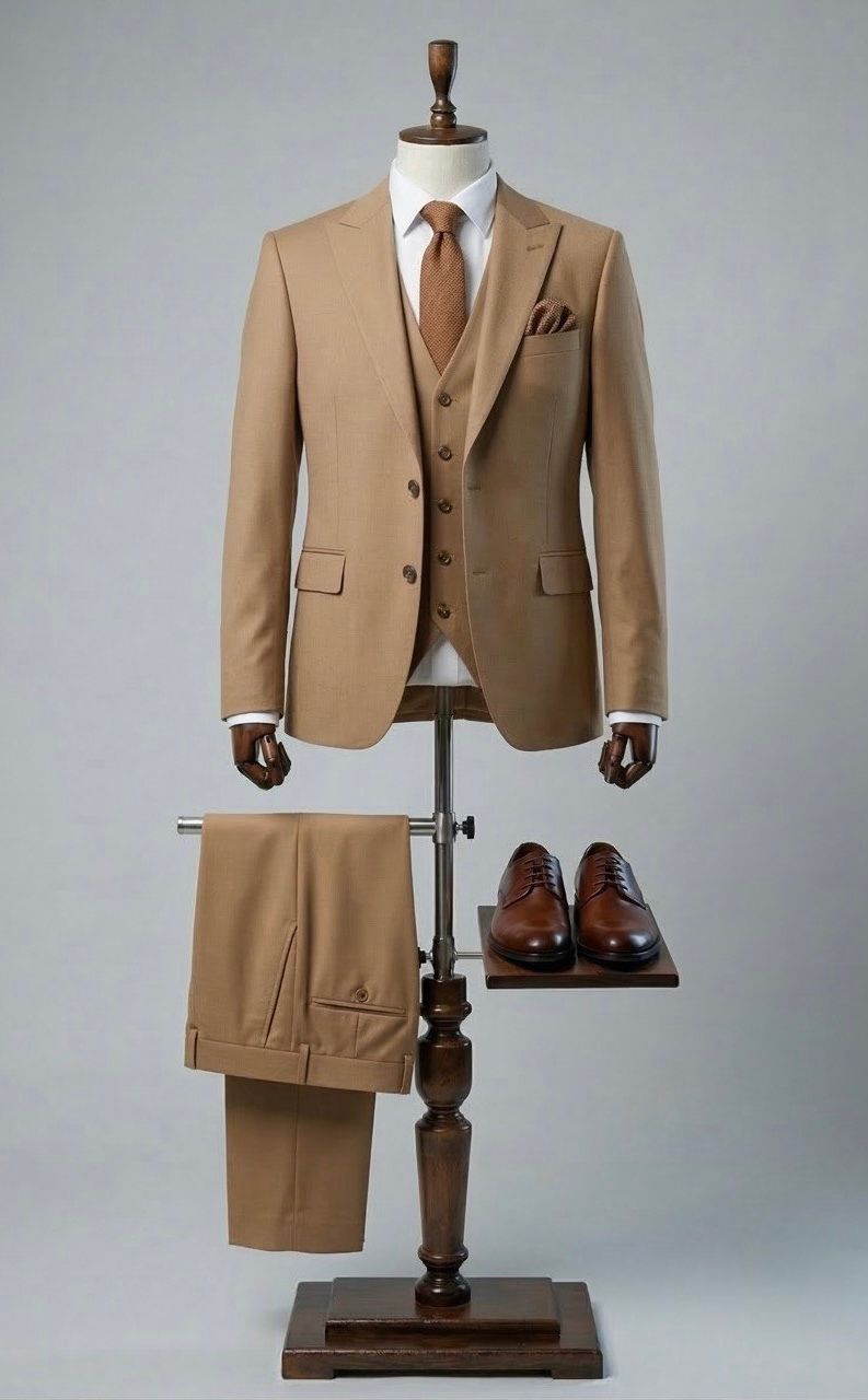 Этот костюм выполнен в очень элегантном песочно-бежевом оттенке. Это цвет стиля «Old Money», который выглядит благородно, легко и идеально подходит для дневных торжеств или летних деловых встреч.
