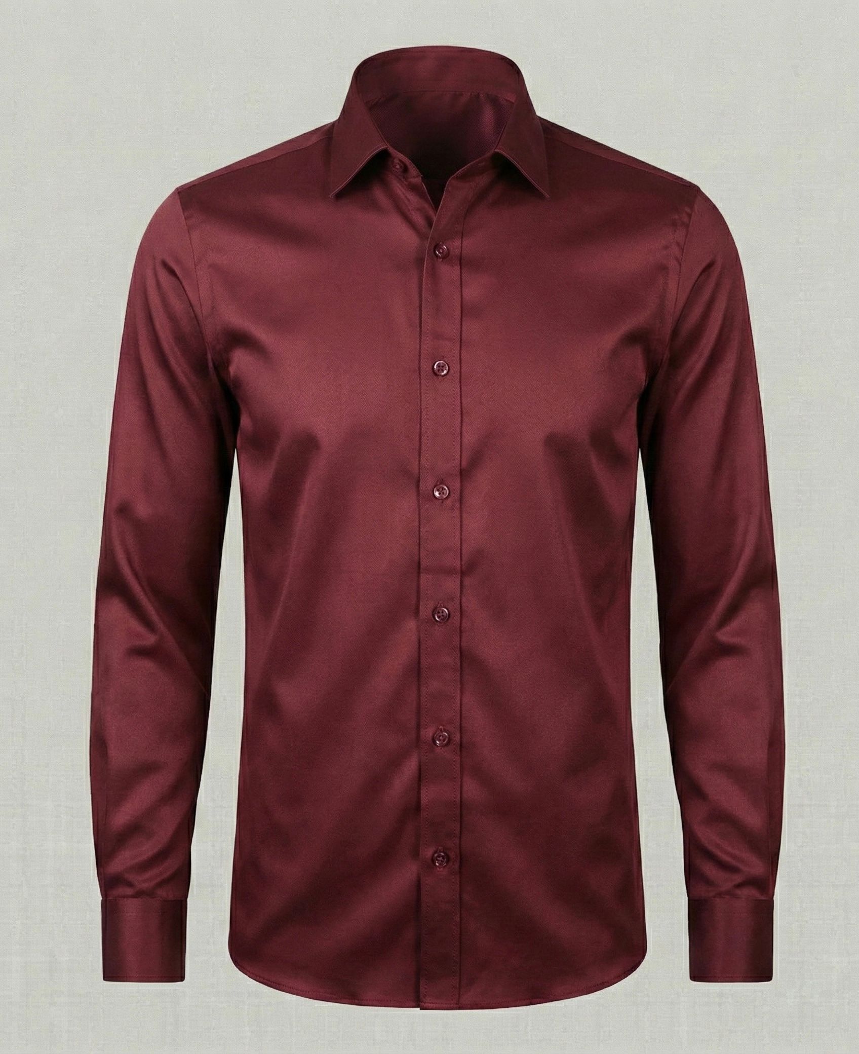 Приталенная рубашка бордового (марсала) цвета с классическим воротником и длинными рукавами (манжеты на пуговицах).