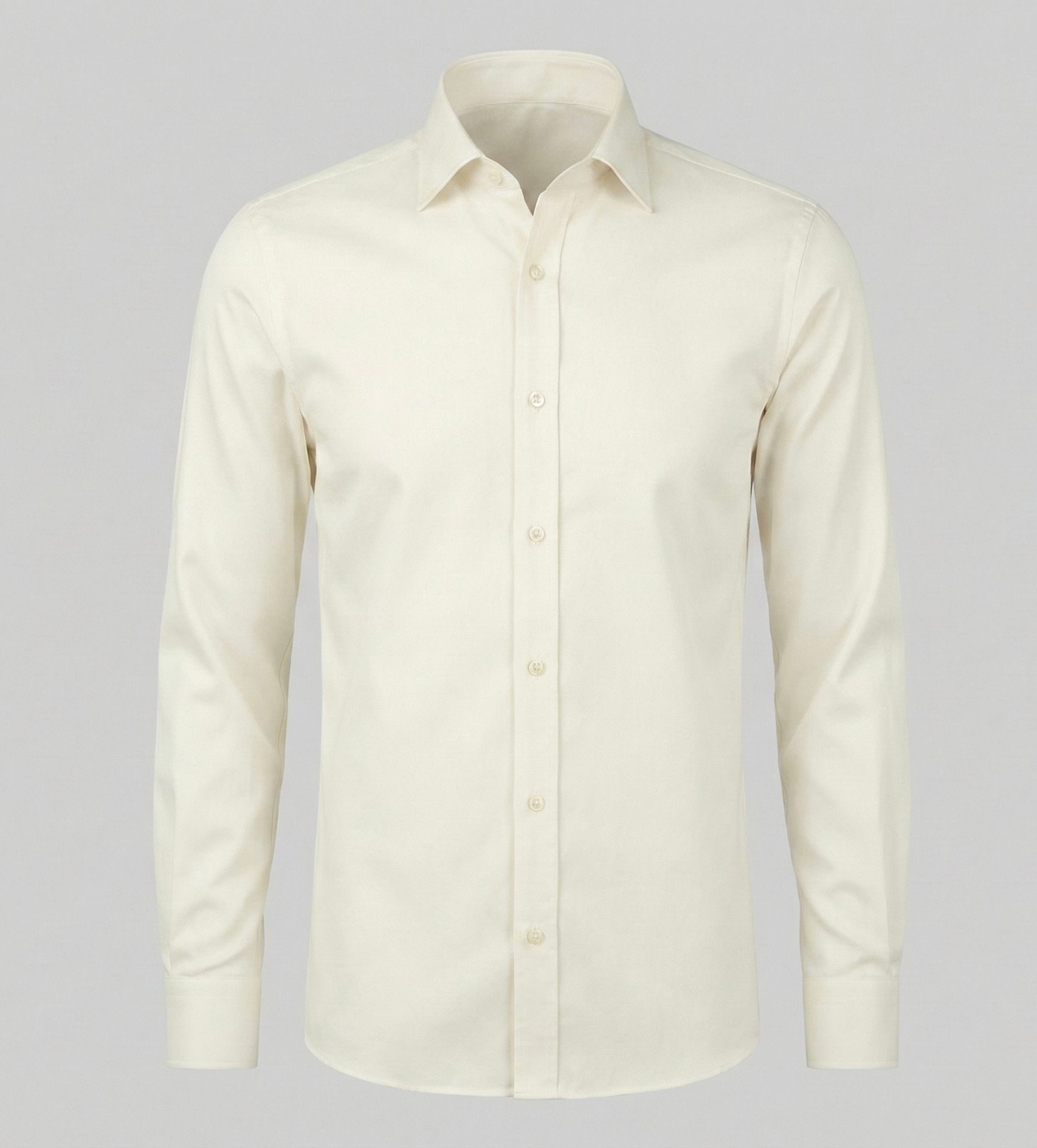 Приталенная рубашка цвета слоновой кости (айвори) с классическим воротником и длинными рукавами (манжеты на пуговицах).